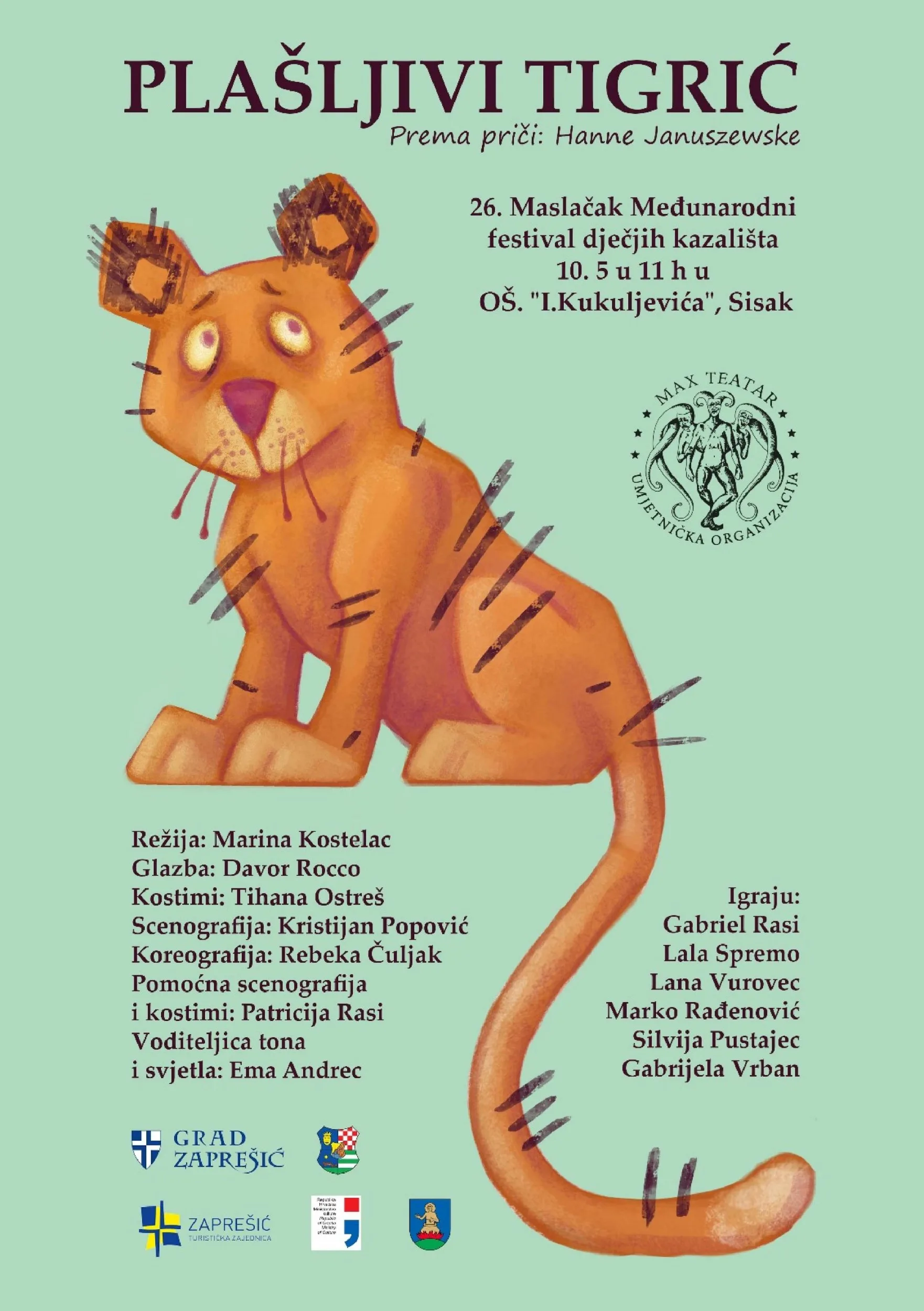 Drugog dana 26. Maslačka pogledajte predstavu Dramskog studija Max teatra iz Zaprešića “Plašljivi tigrić” u petak,10. svibnja 2024. u 11 sati u OŠ I. Kukuljevića Sisak. Predstava je nastala prema priči Hanne Januszewske, u režiji Marine Kostelac, a glume polaznici glumačkog dramskog studija Max teatra: Gabriel Rasi, Lala Spremo, Lana Vurovec, Marko Rađenović, Silvija Pustajec i Gabriela Vrban.