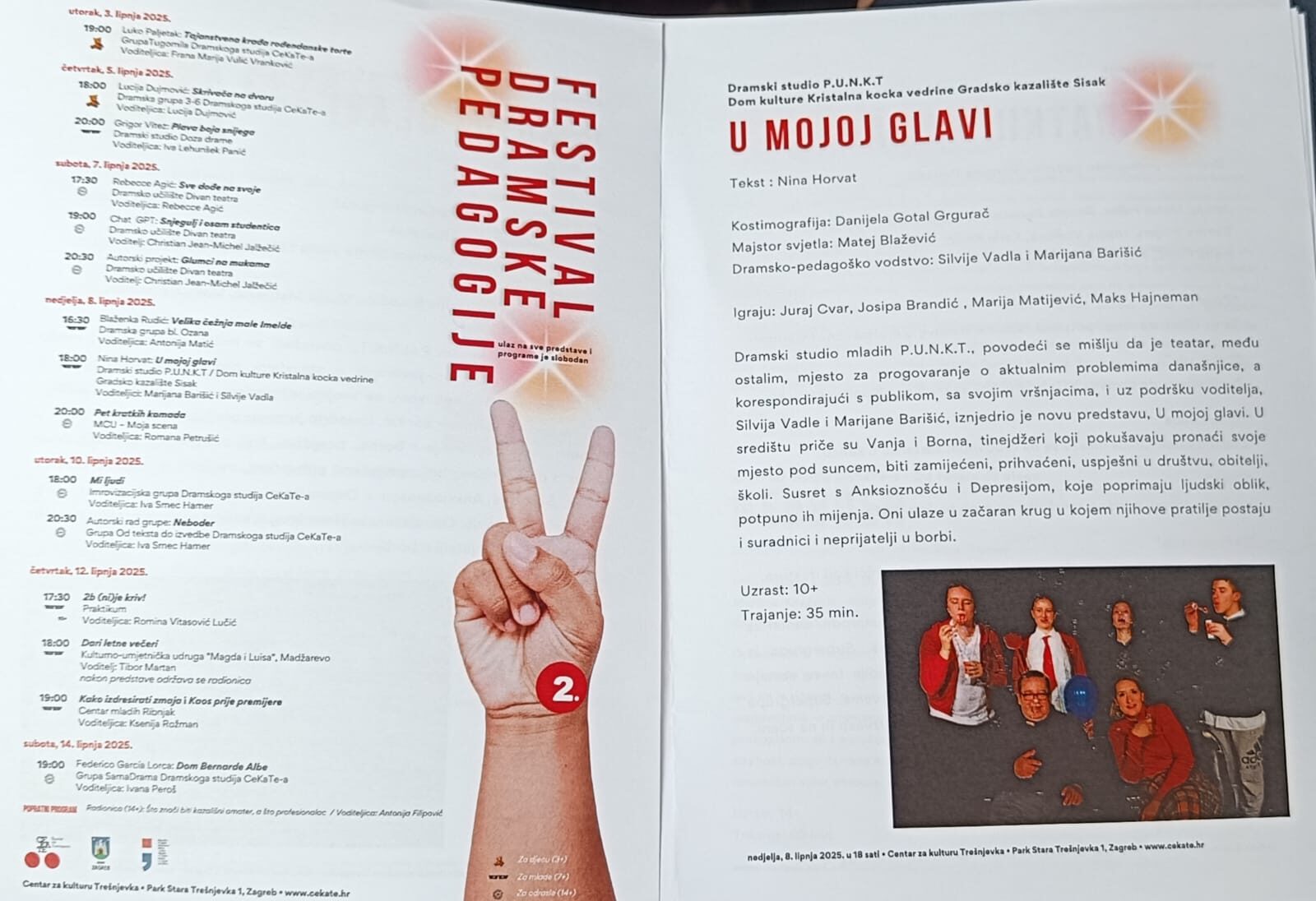 Dramski studio P.U.N.K.T sudjelovao na Festivalu dramske pedagogije Autor objave:Jelena Jelić Objava objavljena:09.06.2025 Kategorija objave:Dramski studio mladih / Gostovanja / Najave Dramski studio P.U.N.K.T. Doma kultre KKV Sisak gostovao je na Festivalu dramske pedagogije. Predstavu “U mojoj glavi” izveli su u nedjelju, 8.6.2025. u Cetru za kulturu Trešnjevka u Zagrebu. Možda nešto kao Premijera komedije Gradskog kazališta Sisak “Sudar” na završnici 12. Prologa 14.11.2019 Tata Slikovnica i NeMirna rasplesali su sisačke mališane na KULturnom ljetu KKV-a 04.07.2022 KULturno LJETO KKV-a 2021. 31.05.2021