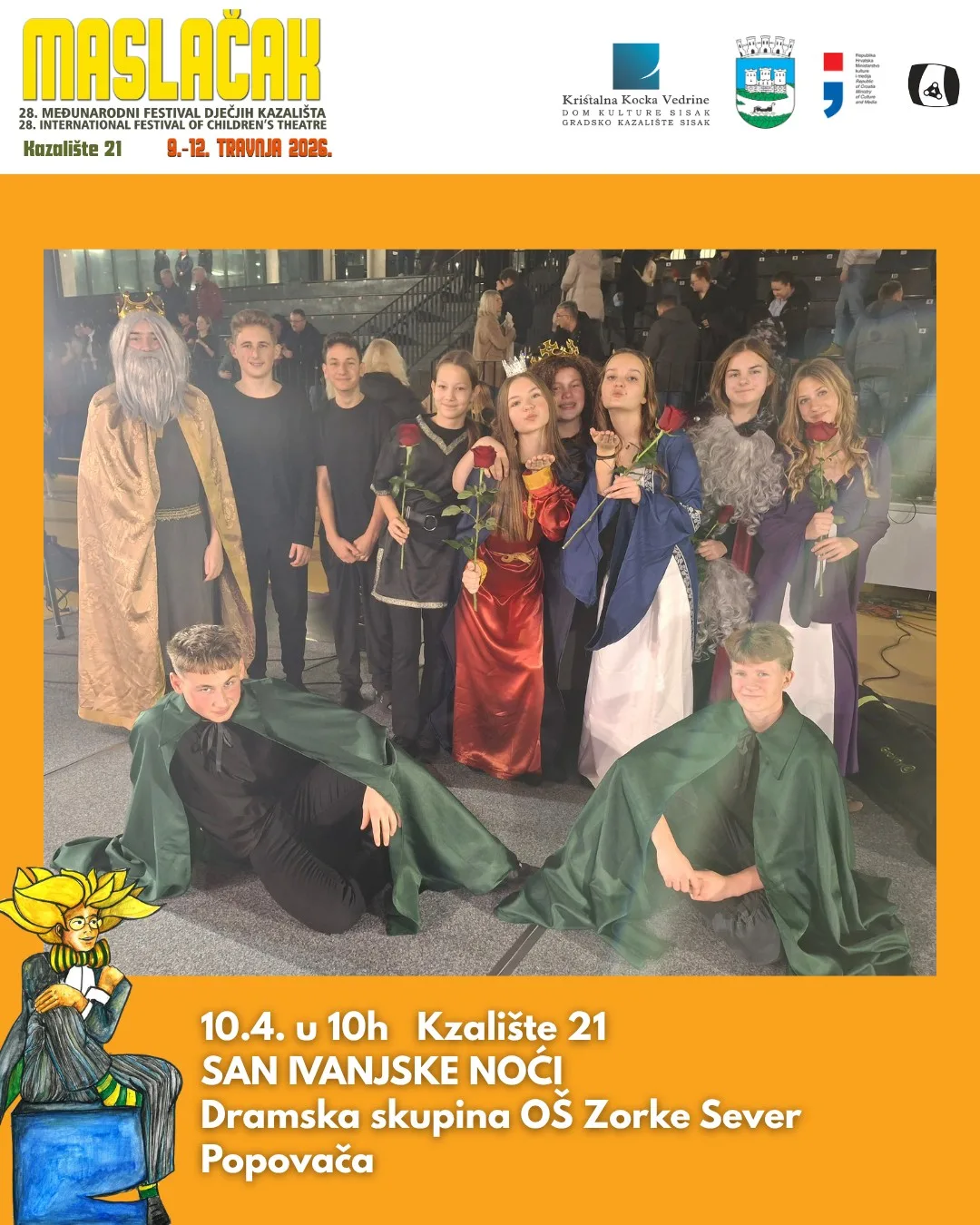 Nakon bogatog prvog dana, Međunarodni festival dječjih kazališta Maslačak nastavlja se u petak, 10. travnja 2026., u Kazalištu 21. Program započinje u 10 sati izvedbom Shakespeareova „Sna Ivanjske noći”, koju su pripremili polaznici dramske skupine Osnovne škole Zorke Sever iz Popovače.