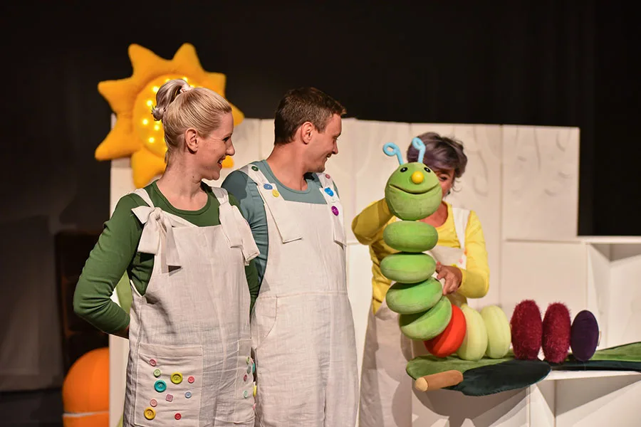 Predstavu izvode Sanja Grgina, Irena Bausović Tomljanović i Lino Brozić, a nastala je prema istoimenoj slikovnici Erica Carle. Kroz svijet odrastanja i otkrivanja okoline, našu najmlađu publiku učimo raznolikosti i povjerenju u proces koji sa sobom donosi uspone i padove, kruške i jabuke, ponedjeljke i petke. Priroda nam otkriva svoje tajne, a mi putujemo, promatramo, osluškujemo, osjećamo i rastemo.