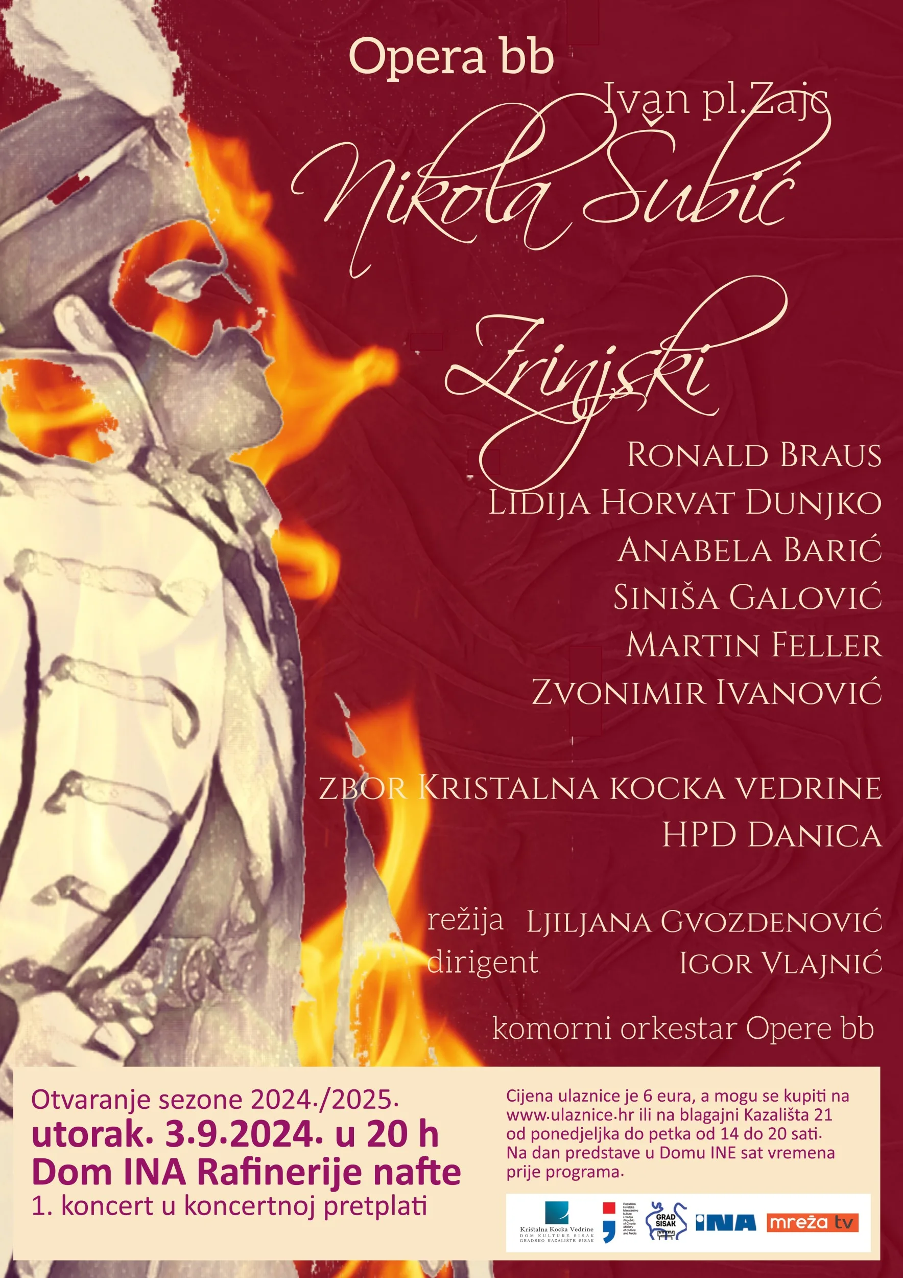 Koncertni repertoar donosi pravu poslasticu za ljubitelje klasične glazbe. Gostovanjem Opere bb otvaramo sezonu 2024./2025. izvedbom opere „Nikola Šubić Zrinski“ u režiji Ljiljane Gvozdenović i pod dirigentskom palicom Igora Vlajnića, kojeg izvode renomirani glazbeni umjetnici Ronald Braus, Lidija Horvat Dunjko, Anabela Barić, Siniša Galović, Martin Feller, Zvonimir Ivanović uz pratnju Zbora Kristalne kocke vedrine i Hrvatskog pjevačkog društva Danica. Koncert je prvi u nizu koncertne pretplate, a na programu u utorak, 3. rujna 2024. s početkom u 20 sati u Domu INA rafinerije.